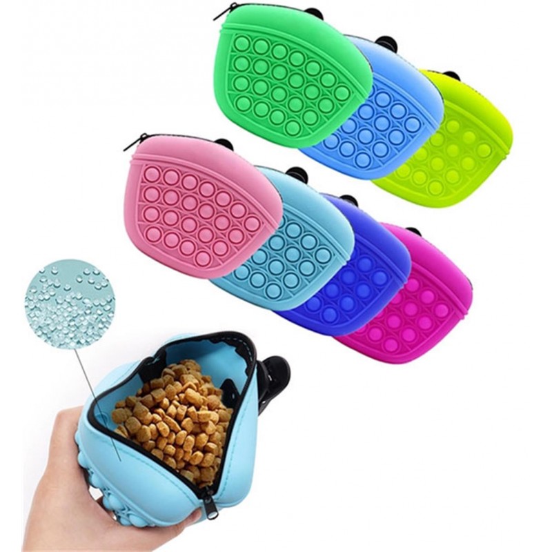 The Dog Treat Pouch is made of food grade silicone which is flexible and sturdy. It has a zipper closure. This dog feeding container has a clip which enables you to carry and attach the pouch to your waist belt, pants or packages, convenient to walk pet outside.