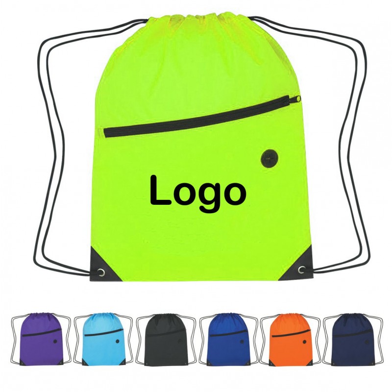 210D nylon drawstring backpack with zippered pocket, features large front zippered pocket, features a drawstring closure, built in slot for ear buds, great for carrying your belongings for hiking, school field trips or events.